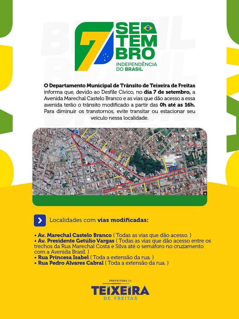 A Prefeitura de Teixeira de Freitas anunciou mudanças no trânsito para a próxima segunda-feira, 7 de setembro, devido à realização do Desfile Cívico de Independência. As alterações começam à meia-noite e seguem até as 16h, afetando algumas das principais vias da cidade.