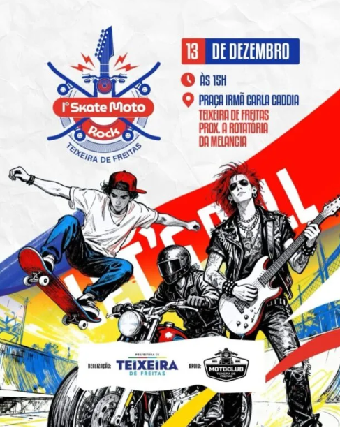 No próximo sábado, dia 13, a Prefeitura de Teixeira de Freitas, em parceria com o Motoclub de Teixeira, realiza a primeira edição do Skate Moto Rock. O evento será realizado na Praça Carla Caddia e promete reunir esporte, arte e música em uma programação diversificada, totalmente gratuita e aberta à população.