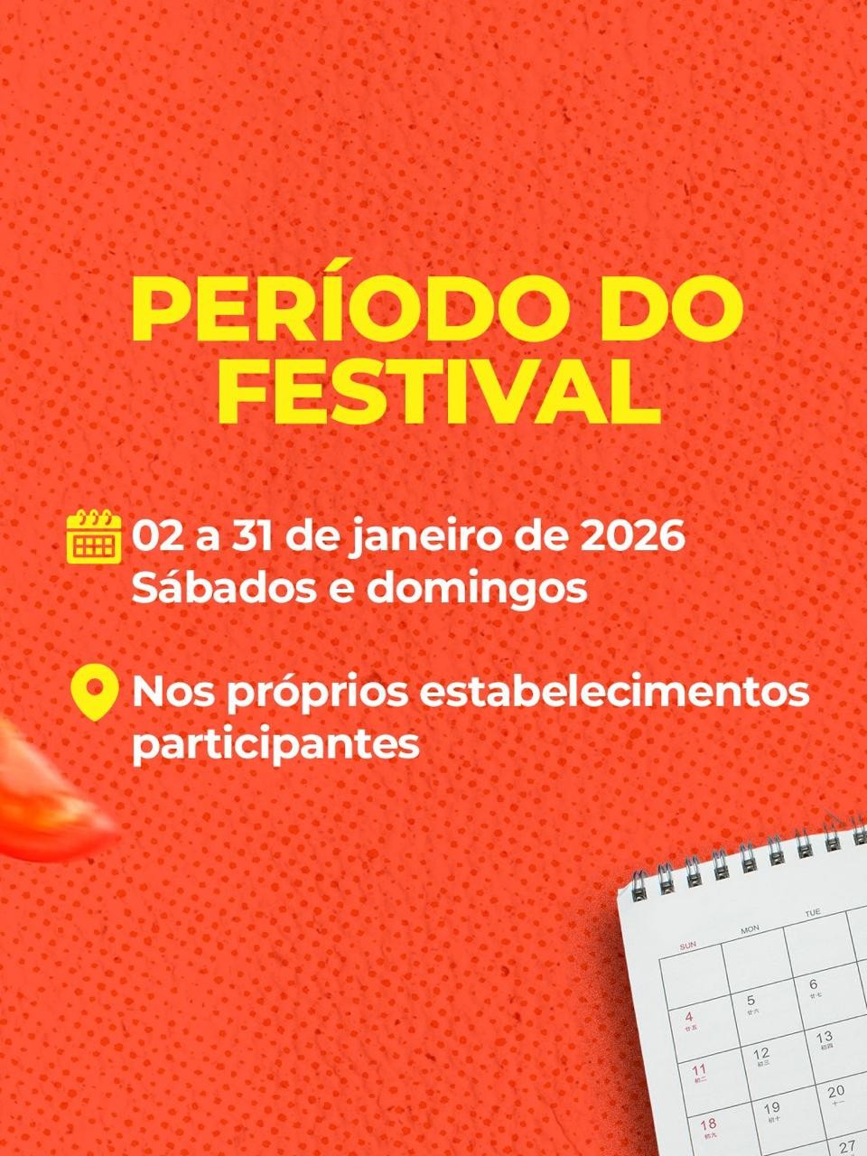 Frutos do mar, carnes, queijos e vegano, ampliando as opções para todos os públicos e promovendo diversidade de sabores. Os pratos serão preparados e apresentados pelos próprios estabelecimentos inscritos, permitindo que moradores e visitantes façam um verdadeiro roteiro gastronômico pela cidade.