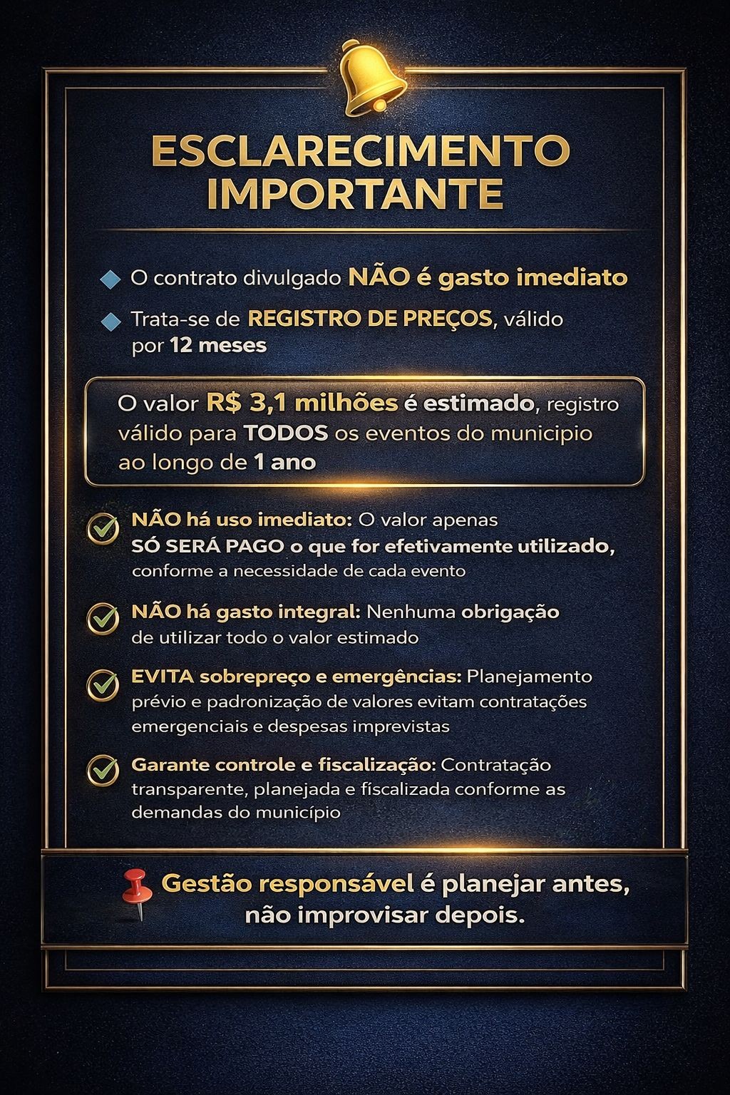 O montante informado é apenas uma estimativa e contempla todos os eventos do município no período, sendo pago exclusivamente o que for efetivamente utilizado, conforme a necessidade de cada ação. Dessa forma, não há desembolso único nem obrigação de uso total do valor previsto.