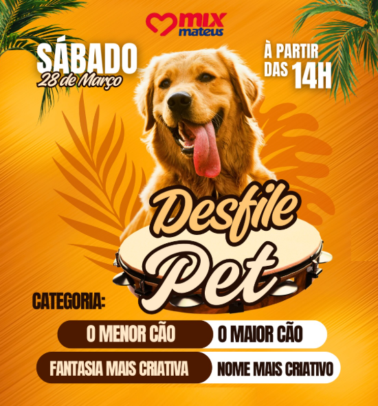 Teixeira de Freitas se prepara para uma tarde especial dedicada aos amantes de animais. Sábado, 28 de março, a partir das 14h, o estacionamento do Mix Mateus será palco de um animado Desfile Pet, evento que integra as comemorações pelos quatro anos do empreendimento na cidade.