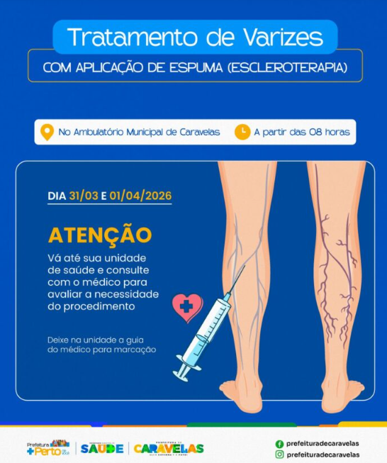 A Prefeitura de Caravelas, por meio da Secretaria Municipal de Saúde, realiza nos dias 31 de março e 1º de abril uma ação voltada ao cuidado vascular da população. A iniciativa oferece atendimento com aplicação de espuma para tratamento de varizes, procedimento conhecido na medicina como escleroterapia.