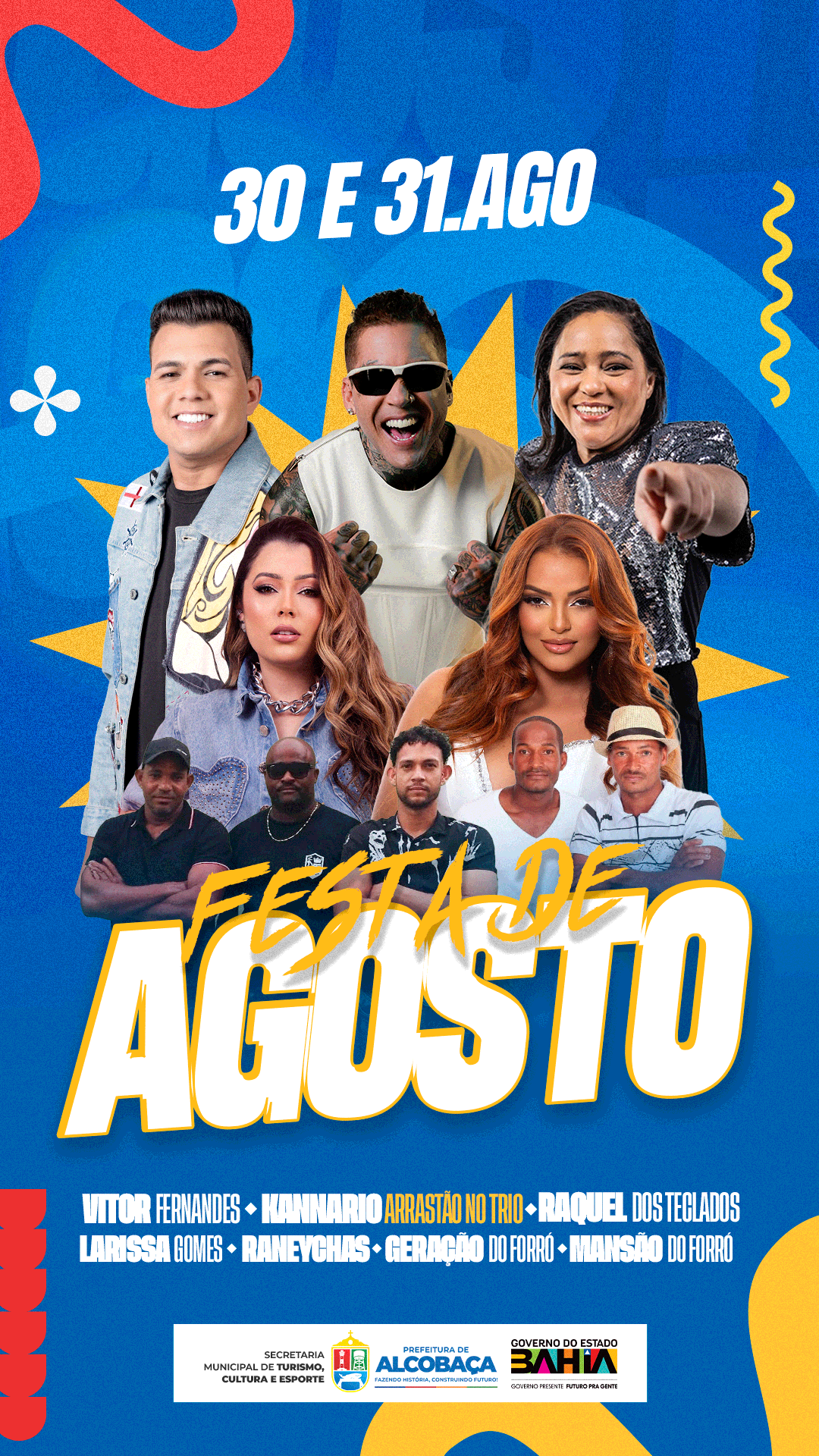 A cidade de Alcobaça se prepara para viver momentos de celebração e cultura com a realização da Festa de Agosto, marcada para os dias 30 e 31 de agosto. O evento é promovido pela Prefeitura Municipal, por meio da Secretaria de Turismo, Esporte e Cultura, e promete atrair grande público para a orla e para os espaços de shows.