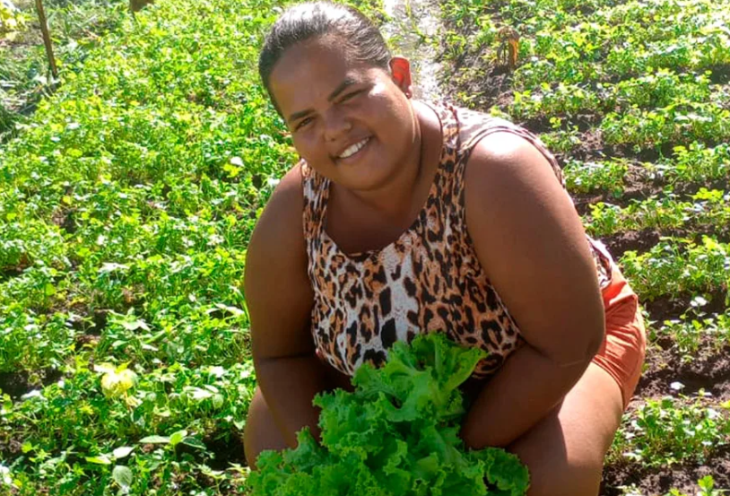 "Aqui eu produzo de tudo um pouco, desde alface, coentro, salsa e cebolinha, até quiabo, feijão de corda, jiló, abóbora, pimentão e algumas frutas também. Com a horta, eu passei a oferecer alimento saudável para minha família e ainda vender o excedente", afirma a agricultora Nathania do Vale Lima.